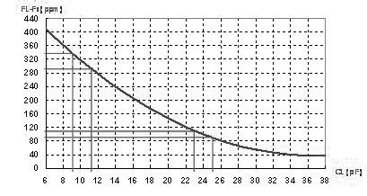 頻率的“牽引率”指的是負(fù)載電容CL1的頻率FL1到負(fù)載電容CL2的頻率FL2的頻率變化. 在(圖十一)中可以是FL1(CL=24pF)與FL2(CL=10pF)的頻率變化值. 在這個(gè)例子中的頻率牽引率是 220 ppm. 若我們將CL1與CL2的負(fù)載電容值趨近極小化(曲線作數(shù)學(xué)上的微分), 就會(huì)得到曲線的切線值. 這個(gè)切線值就是用某一個(gè)負(fù)載電容的敏感度( trim sensitivity ).