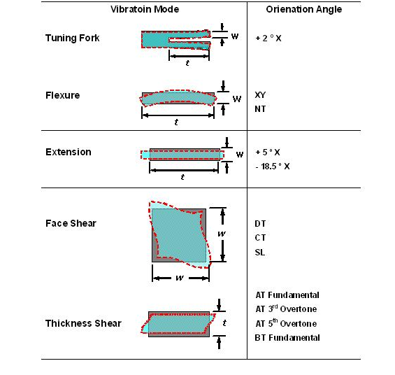 經(jīng)由不同的石英切割角度及不同電極型狀的電場效應(yīng), 石英芯片展現(xiàn)了各種不同的振動模態(tài). 以經(jīng)常產(chǎn)生的振動模態(tài)可以概分為擾曲模態(tài)(flexure mode), 伸縮模態(tài)(extension mode), 面剪切模態(tài)(face shear mode) 和 厚度剪切模態(tài)(thickness shear mode). 這幾種振動模態(tài)以簡單的方法在表一中可以看到. 在實際狀況中, "1XSH020000AVZ"石英芯片并不是一定祇有單一種振動模態(tài), 而可能有多種模態(tài)同時存在在一個石英芯片的振蕩中, 經(jīng)由適當(dāng)?shù)脑O(shè)計, 可以壓制其它不希望產(chǎn)生的振動模態(tài)(unwanted mode), 來達(dá)到主要振動模態(tài)的最佳化.