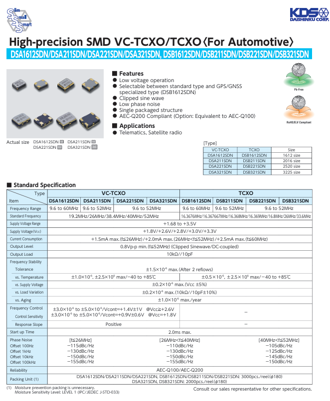 1XXH26000MCB溫補晶振,DSB1612SDN日本晶振,KDS大真空晶振