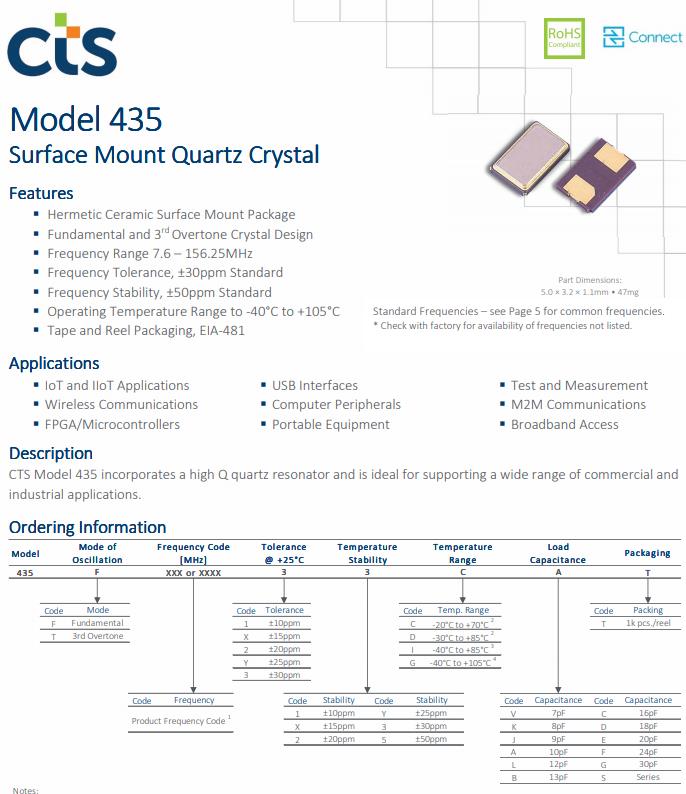 CTS晶振公司推出的435型的標(biāo)準(zhǔn)產(chǎn)品特性和常見市場應(yīng)用總結(jié)如下。