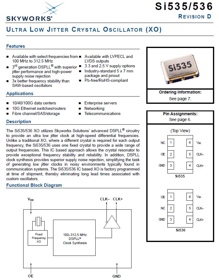 編碼536BB156M250DG,頻率為156.25MHz,Si535/536 XO時鐘振蕩器,OSC石英晶體振蕩器,采用Skyworks Solutions先進的DSPLL®電路在高速差分頻率下提供超低抖動時鐘。不像傳統(tǒng)的XO,每個輸出都需要不同的晶體頻率,Si535/536使用一個固定晶體提供廣泛的輸出頻率。這種基于集成電路的方法允許晶體諧振器提供卓越的頻率穩(wěn)定性和可靠性。此外,DSPLL時鐘合成提供了優(yōu)越的電源噪聲抑制,簡化了任務在嘈雜的環(huán)境中產生低抖動時鐘的方法通信系統(tǒng)。基于Si535/536 IC的XO是工廠編程的在發(fā)貨時,從而消除了較長的交貨時間定制的振蕩器。