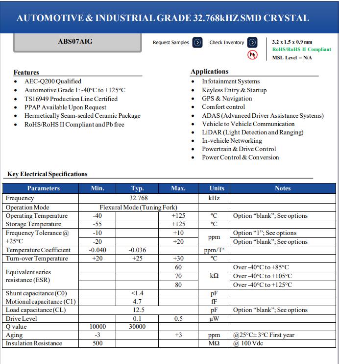 隨著行業(yè)的需求增長(zhǎng),艾博康公司推出編碼ABS07AIG-32.768KHZ-9-1-T無源晶振,符合AEC-Q200標(biāo)準(zhǔn) 汽車1級(jí):-40°C至+125°C TS16949生產(chǎn)線認(rèn)證 PPAP可應(yīng)要求提供 氣密接縫密封陶瓷封裝 符合RoHS/RoHS II標(biāo)準(zhǔn),無鉛.應(yīng)用程序 信息娛樂系統(tǒng) 無鑰匙進(jìn)入和啟動(dòng)GPS和導(dǎo)航,舒適控制 ADAS(高級(jí)駕駛輔助系統(tǒng)),車輛對(duì)車輛通信,激光雷達(dá)(光探測(cè)和測(cè)距) 車載網(wǎng)絡(luò),動(dòng)力系統(tǒng)和驅(qū)動(dòng)控制,電源控制和轉(zhuǎn)換.