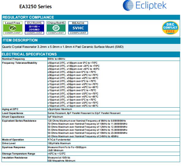 | EA3250FA18-25.000M TR | Ecliptek石英晶體 | EA3250 | MHz 晶體 | 25 MHz | ±50ppm | ±30ppm | 18pF | CRYSTAL 25.0000MHZ 18PF SMD |