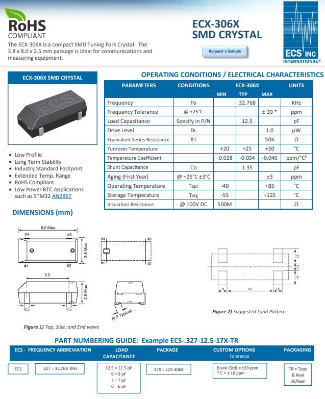 | ECS-.327-12.5-12QS-TR | CRYSTAL 32.768KHZ 12.5PF SMD | ECX-12Q | kHz Crystal (Tuning Fork) | 32.768kHz | - | AEC-Q200 | Surface Mount | 2-SMD, No Lead | 0.079" L x 0.047" W (2.00mm x 1.20mm) |