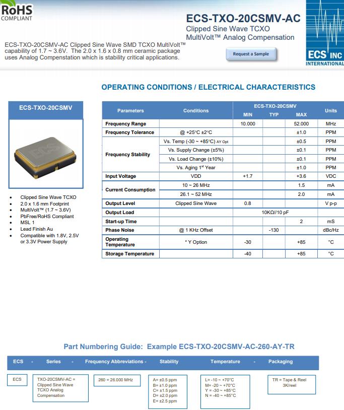 ECS晶振推出的溫度補償晶體振蕩器在1.7V至3.6V的多電壓能力和 1.8V、2.5V、3.0V 的靜態(tài)電源下,在-30°C至+85°C提供±0.5 ppm的超嚴密穩(wěn)定性選項,和3.3V。ECS-TXO-20CSMV-AC使用高刷新率或頻率校準率,在溫度補償期間保持線性頻率輸出。2.0 x 1.6 x 0.8 mm封裝使其適用于無線、Wi-Fi和物聯(lián)網(wǎng)應用。削波正弦波溫補晶振為精密應用提供超緊密的穩(wěn)定性ECS-TXO-20CSMV-AC-260-AY-TR