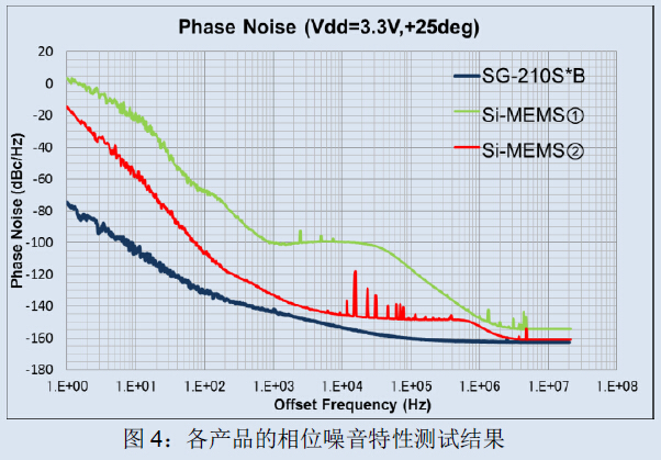 《圖4》表示3.3V電源電壓、+25℃條件下的石英晶體振蕩器與全硅MEMS振蕩器的相位噪音特性實(shí)測(cè)結(jié)果。