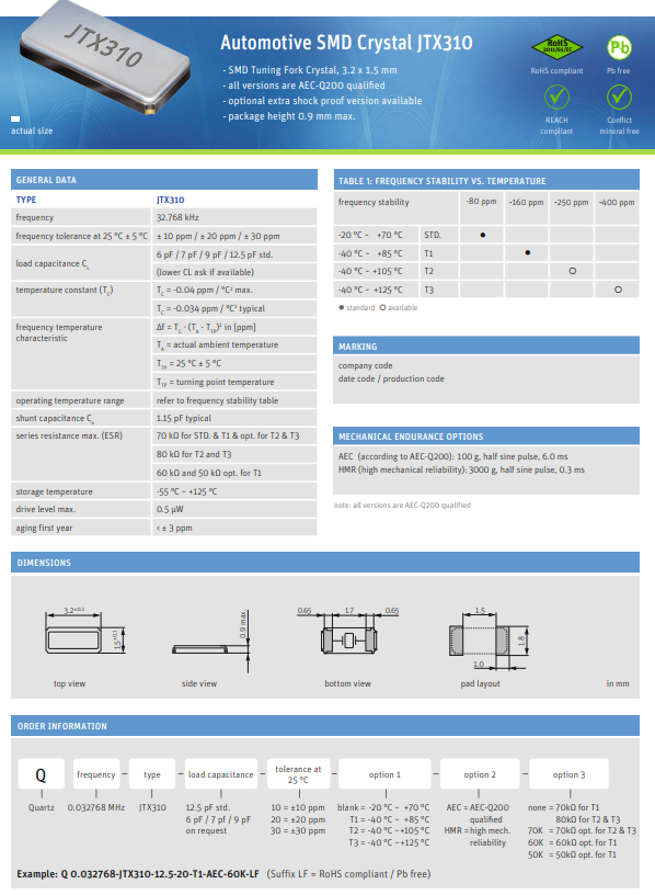 | Q 0.032768-JTX310-12.5-20-T2-HMR-70K-LF | Jauch Quartz | JTX310 | 32.768kHz | ±20ppm | 12.5pF | -40°C ~ 105°C | 2 | (3.20mm x 1.50mm) | 0.035" (0.90mm) |