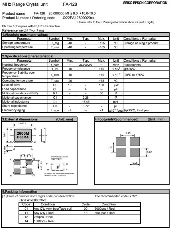 | Q22FA1280002600 | 2 x 1.6 x 0.5mm | FA-128 | 26.000000 MHz | 8 pF | +/-10 ppm |