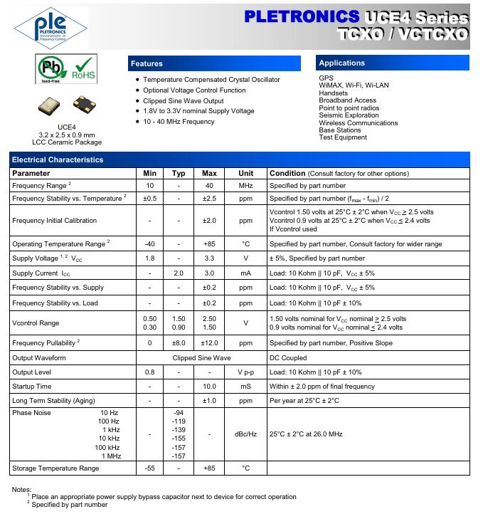 | UCE4031035LK015000-26MDK | Pletronics, Inc | TCXO OSCILLATORS 3225 4-SMD TCXO | 削峰正弦波 | 3.3V | 1.5ppm | -40°C ~ 85°C | 3225 | 3225 |