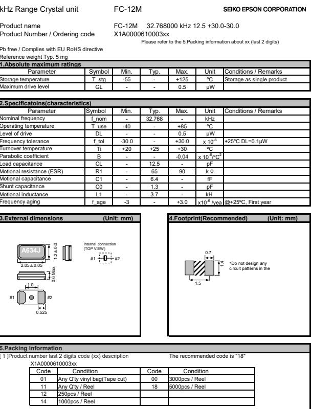 | X1A000061001400 | 2.05 x 1.2 x 0.6 mm | FC-12M | 32.768kHz | 12.5 pF | +/-10.0 ppm | -40 to +85 °C |
