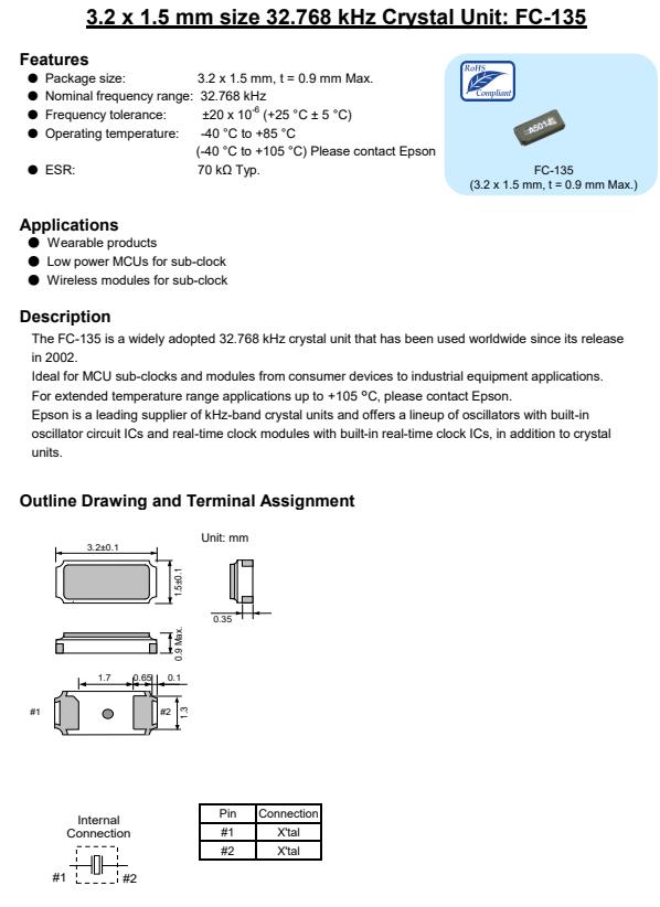 | X1A0001410005 | 3.2 x 1.5 x 0.9 mm | FC-135R | 32.768kHz | 12.5 pF | +/-10.0 ppm | -40 to +85 °C |