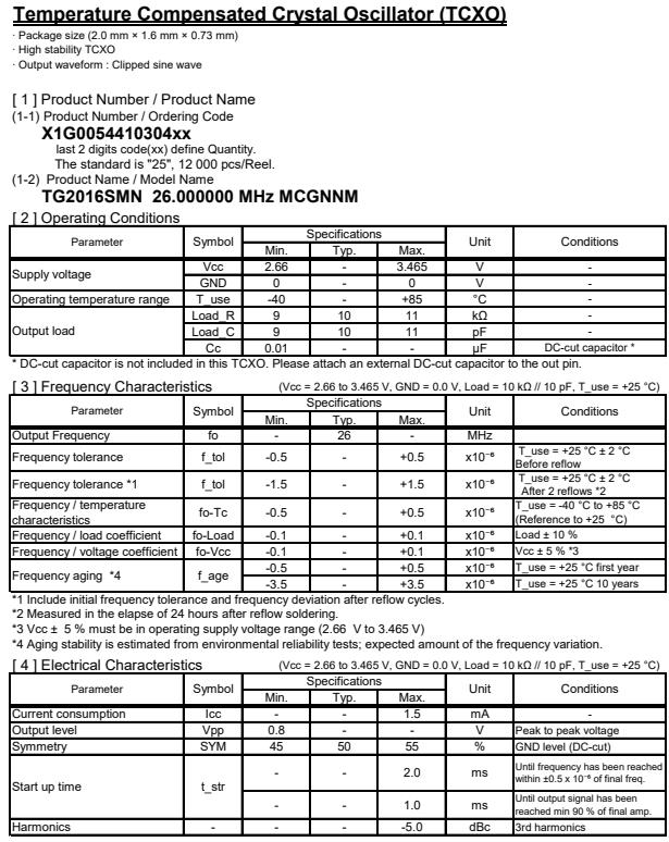 | X1G005441030425 | TG2016SMN | 26.000000 MHz | 2.00 x 1.60 x 0.73 mm | 2.660 to 3.465 V | +/-1.5 ppm | -40 to +85 °C | +/-0.50 ppm |