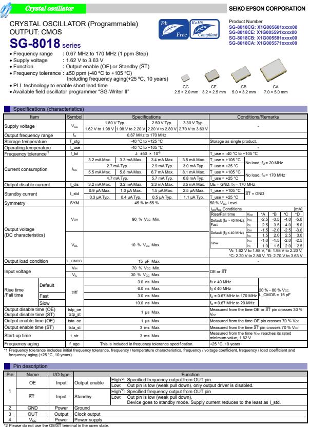 | X1G005581003400 | SG-8018CB | 8.000000 MHz | 5.00 x 3.20 x 1.30 mm | CMOS | 1.620 to 3.630 V | -40 to 105 °C | +/-50 ppm |