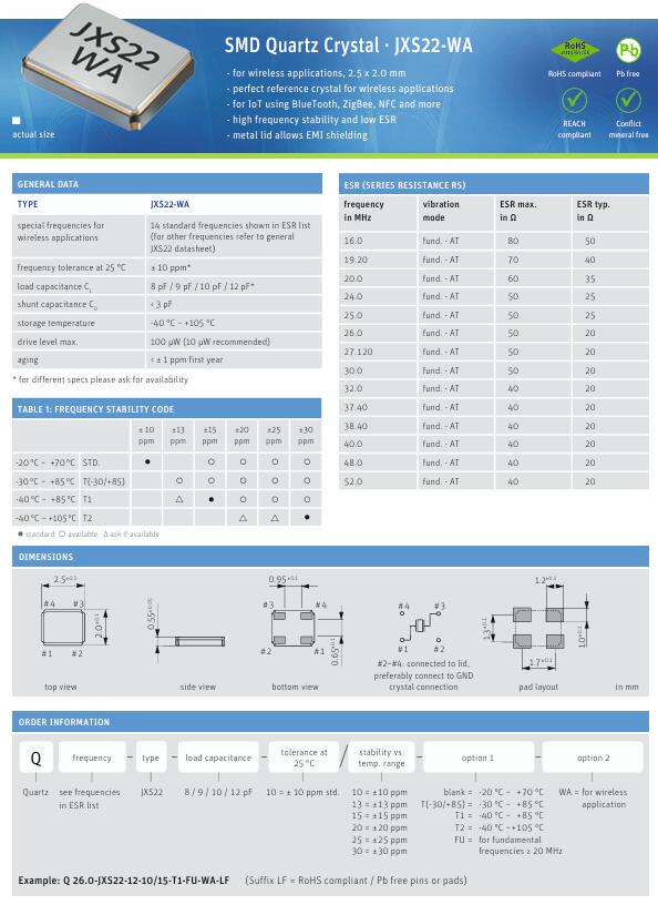 | Q 19.2-JXS22-10-10/10-WA-LF | Jauch Quartz | 19.2MHz | ±10ppm | 10pF | -20°C ~ 70°C | 4 | 2520 |